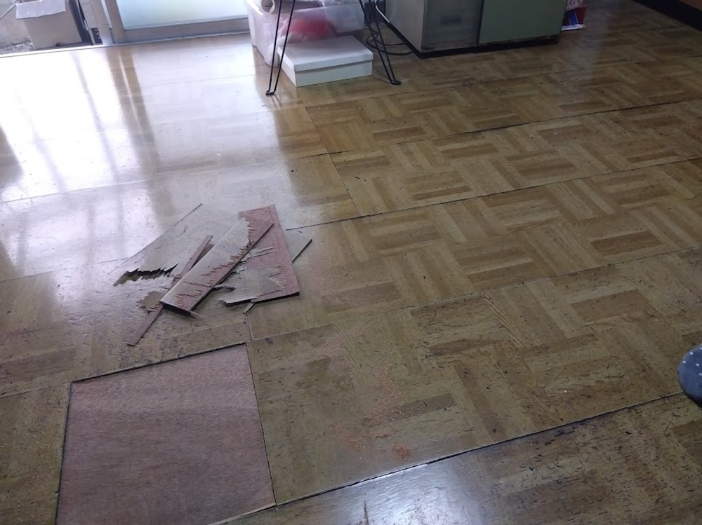 床材が浮いている原因を調査したところ、床材の接着剥がれが原因であることが判明いたしました。
