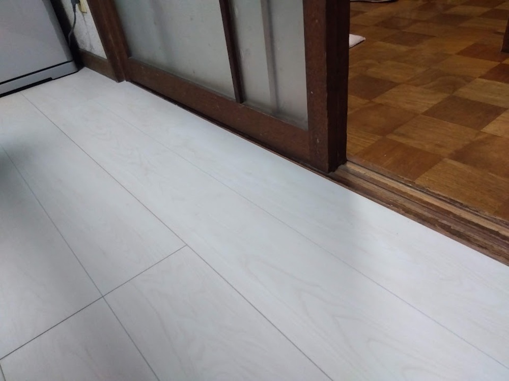 キッチン内の複数箇所で床材の浮きが見られる状態でした。