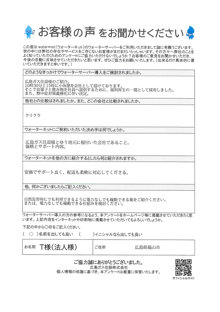 A1.以前は電解水素水整水器を付けカートリッヂを交換しながら利用していたところ 広島ガス住設様のおすすめでウォーターサーバーを知りました