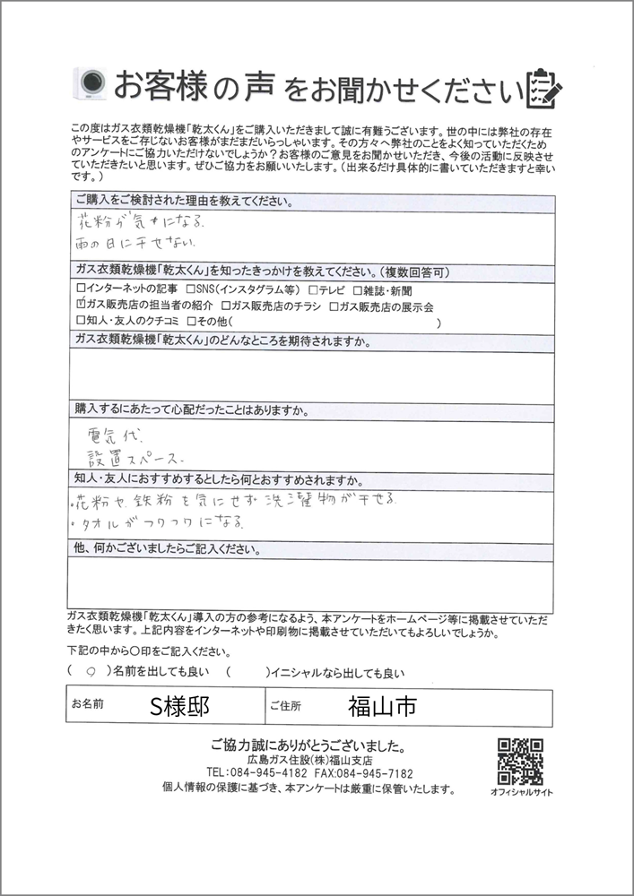 【福山市ガス衣類乾燥機かんたくん】花粉が気になる・雨の日に干せないことがお悩みだったお客様
