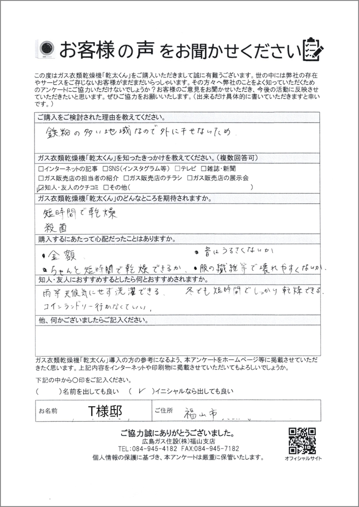 (福山市乾太くん)鉄粉の多い地域のため外に干せないことがお悩みだったお客様