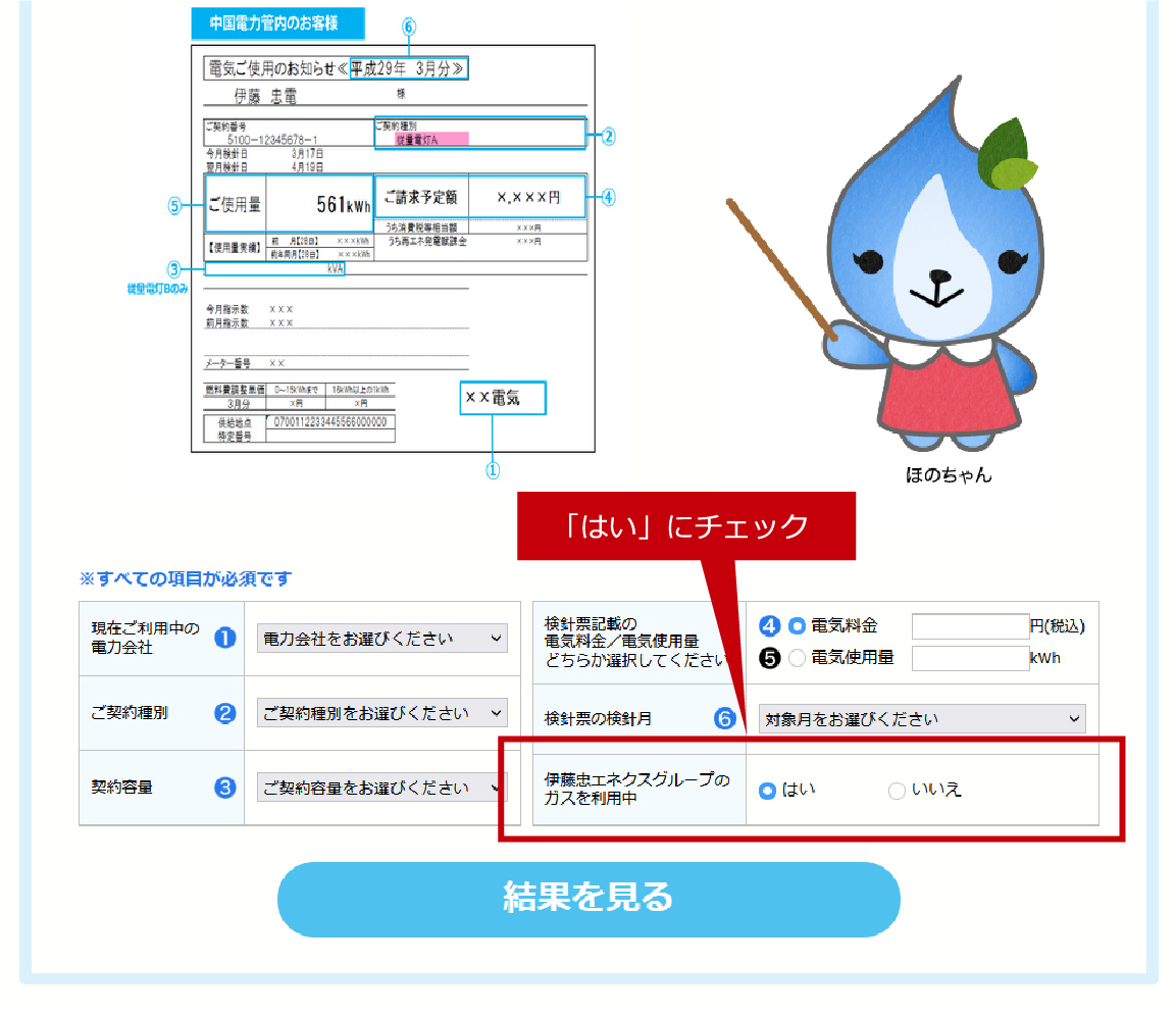 なお、「伊藤忠エネクスグループのガスを利用中」は「はい」にチェックを入れてください。