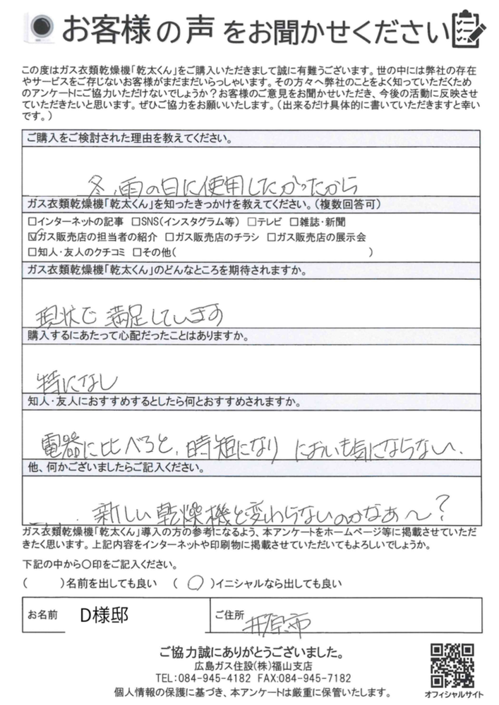 ガス衣類乾燥機「乾太くん」導入後のお客様の声